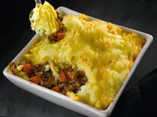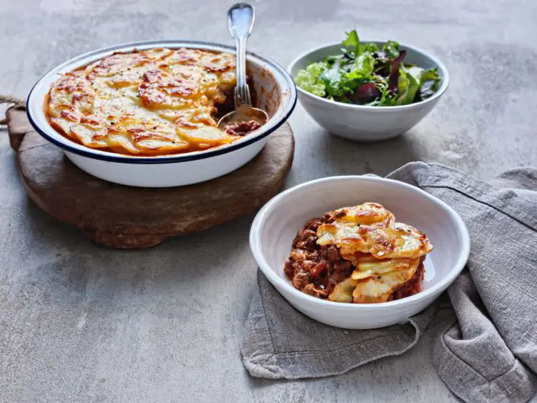 Transfer the mince into an ovenproof baking dish. Top with the garlic potatoes. Sprinkle the cheese over the top. Cover with tin foil and bake in the preheated oven for 30 minutes. After the first 20 minutes remove the foil to allow the potatoes to brown.