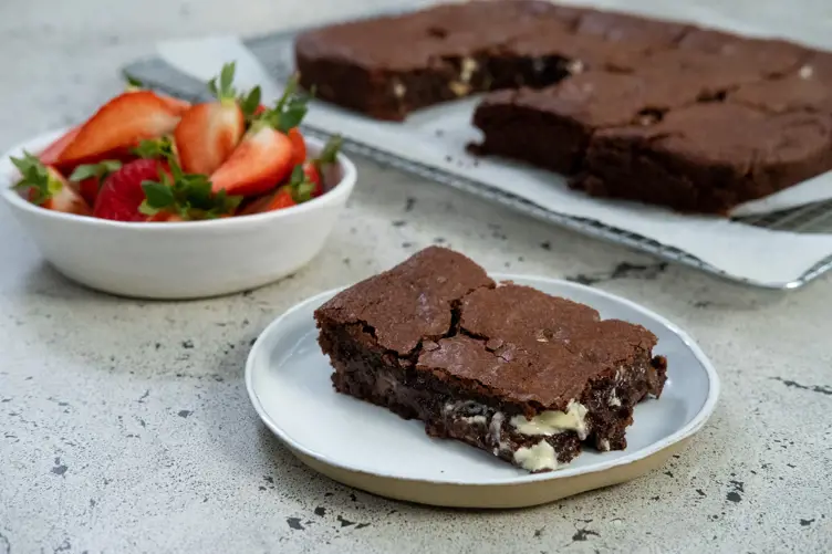 Bake for 20-25 minutes until the top is baked but it remains gooey inside. Chill and serve with Irish Strawberries and lightly whipped cream.