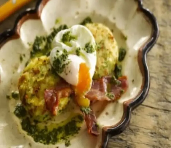 Divide the potato cakes between four warmed plates. Add two rashers, a poached egg, a drizzle of the Mojo Sauce and a green salad.