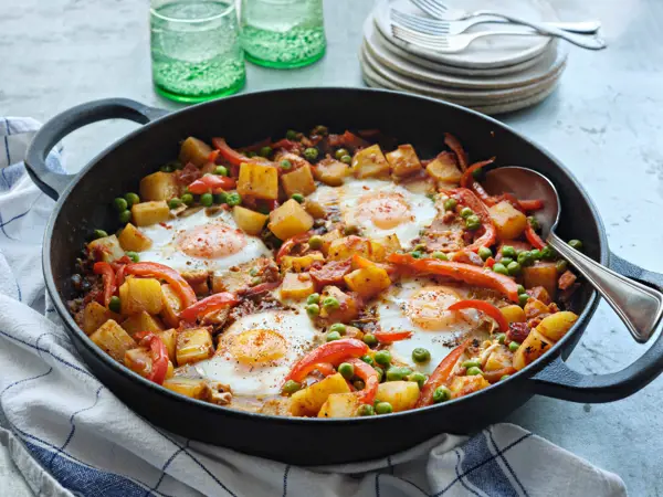 Scatter the peas over the sauce then make four dips with the back of a spoon, large enough to hold an egg. Break the eggs into the dips in the sauce, cover and cook over a medium heat for 5 to 6 minutes or until the whites are set and the yolks are still runny.