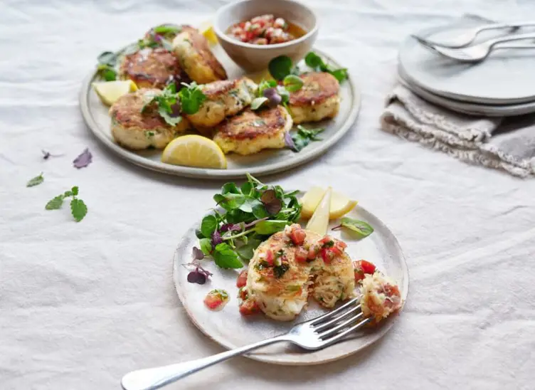 To cook: Heat the oil and a knob of butter in a large frying pan over a medium heat and add in half the crab cakes. Fry gently for 4-5 minutes on each side until golden and heated through. Cover with tin foil and keep warm while you cook the remaining crab cakes.