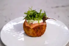 Season the sauce with your wine/fish stock mix, then finish with mustard, lemon zest and juice. Pour the sauce over the pie mix, top with the mashed potato, and bake at 200°C for 30 minutes until the top is golden brown.