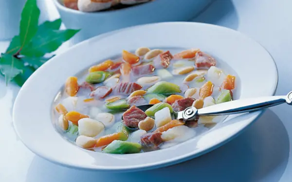 Cover again with cold water and add the onion, leeks, carrots, potatoes, garlic and thyme. Bring to the boil. Reduce the heat and simmer gently for 40 minutes.
