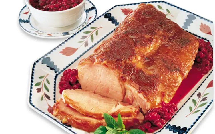 Sauce: Pour off the juices from the joint. To this add the redcurrent jelly, port and redcurrants. Simmer until you have a good rich consistency. Carve the joint and serve with sauce.