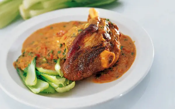 Set oven Gas mark4 180°C(350°F). Add the lamb shanks to the sauce. Cover and place in the oven for approx. 2 ½ hours or until the meat should be fork tender and fall from the bone. For the last 10 minutes stir in the chopped spinach or Chinese leaves.