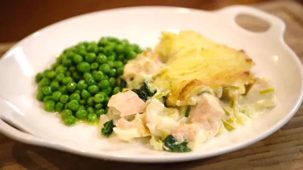 Serve the fish pie straight to the table with a separate bowl of buttered peas.