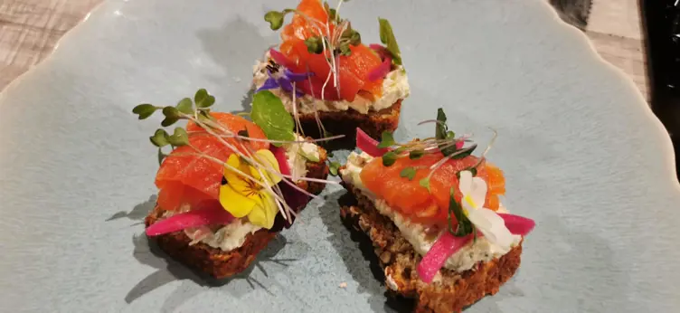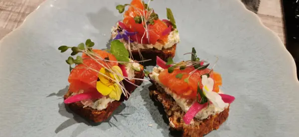 To serve, place slices of porridge bread on each plate. Top each one with 1 tablespoon of the cream cheese mixture, followed by a round of smoked trout. Add pickled red onion and garnish with salad leaves, to serve.