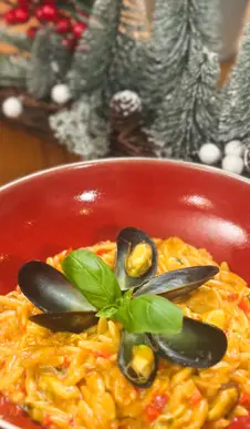 Add all the mussels, cherry tomatoes, a squeeze of lemon juice, the cream and reserved cooking liquid and gently warm through, taste and season with some black pepper. As the mussels are naturally salty you shouldn’t need any salt.