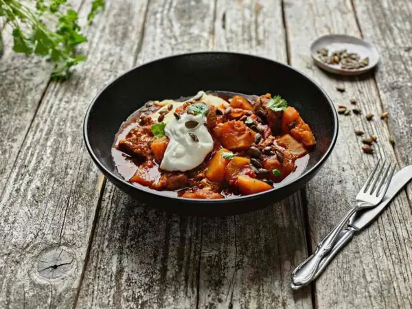 To serve: Serve with rice or mashed potatoes. Drizzle some yogurt, some coriander and a handful of toasted pumpkin seeds on each portion.