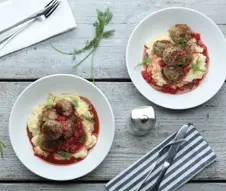 Serve the dish straight to the table and have bowls of boiled potatoes and tenderstem brocolli to hand around separately.