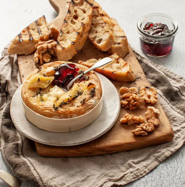 Place the baked cheese on a board with the garlic bread and walnuts to serve.
