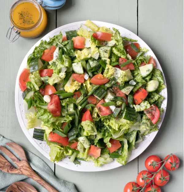 The Fresh and Easy Leafy Green Salad is a light and refreshing dish, perfect for serving eight. Made with crisp Cos lettuce, cucumbers, tomatoes, scallions, and fresh dill, it's tossed in a simple apple cider vinaigrette. Ready in just 10 minutes, this healthy salad is a great side for any meal.