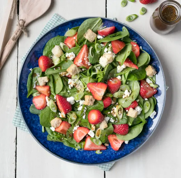 Place the spinach in a large serving bowl. Add the strawberries and scallions. Drizzle about half of the dressing over the salad and toss to coat the leaves.